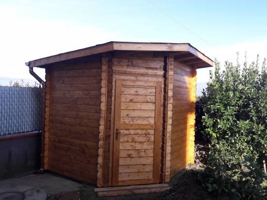 Casetta in legno dŽabete pentagonale . Pareti di spessore mm.32 . Copertura con perlinato e guaina ardesiata . N.01 porta e N.01 finestra