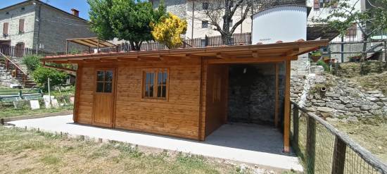 Casetta in legno dŽabete con porticato laterale e aggetto frontale