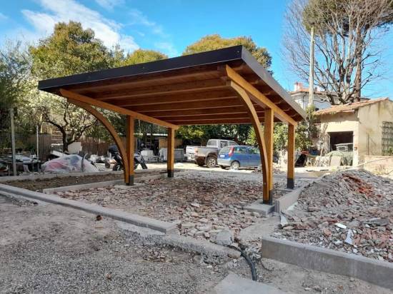 Struttura in abete lamellare . Pilastri e travi dimensionati secondo calcoli strutturali . Copertura con perlinato di cm.2,0 , guaina ardesiata