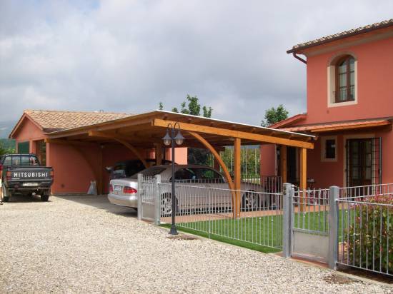 Struttura in abete lamellare con pilastri , travi e archi dimensionati secondo calcoli strutturali . Copertura con perlinato e guaina ardesiata .