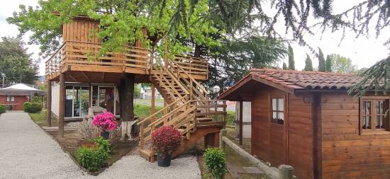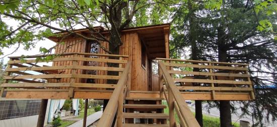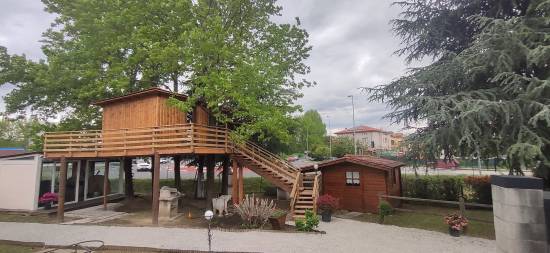 Struttura in abete lamellare con pilastri e travi dimensionati secondo calcoli strutturali . Casetta a telaio . Pareti di spessore mm.42 . Copertura con perlinato e guaina ardesiata . N.02 porte e N.01 finestra