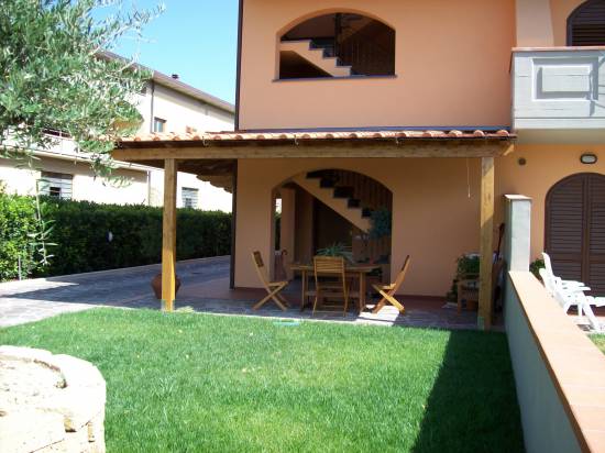 Porticato e pensilina ad angolo in legno dŽabete lamellare . Pilastri e travi dimensionati secondo calcoli strutturali . Copertura con perlinato , guaina e tegola toscana in polipropilene