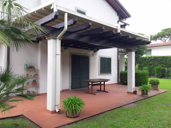Struttura in abete lamellare con travi dimensionati secondo calcoli strutturali . Copertura con perlinato e guaina ardesiata .