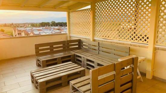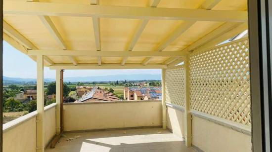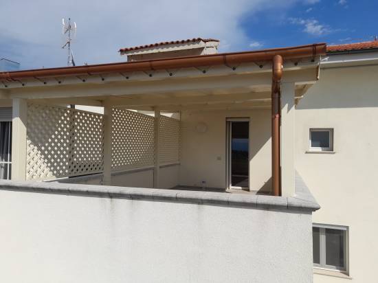 Struttura in abete lamellare con pilastri e travi dimensionati secondo calcoli strutturali . Laccata . Copertura con perlinato e guaina ardesiata .