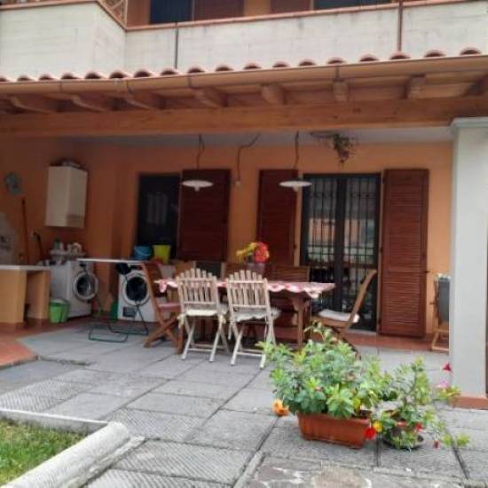 Struttura in abete lamellare con pilastri e travi dimensionati secondo calcoli strutturali . Copertura con perlinato e guaina e tegola toscana in pvc.