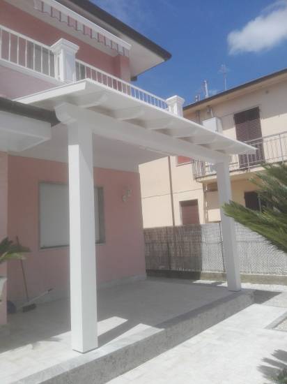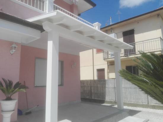 Struttura in abete lamellare con pilastri e travi dimensionati secondo calcoli strutturali . Laccata . Copertura con perlinato e guaina ardesiata .