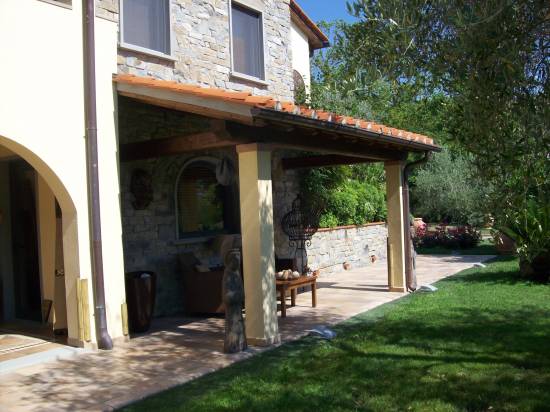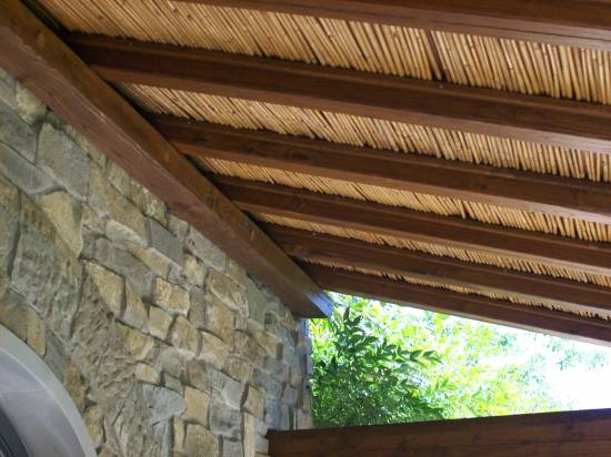 Struttura in abete lamellare con travi dimensionati secondo calcoli strutturali . Copertura con perlinato , guaina e coppo toscano in laterizio
