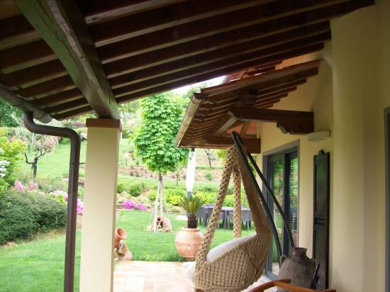 Struttura in abete lamellare con travi dimensionati secondo calcoli strutturali . Mensole di cm.12x12 . Copertura con perlinato e guaina ardesiata .
