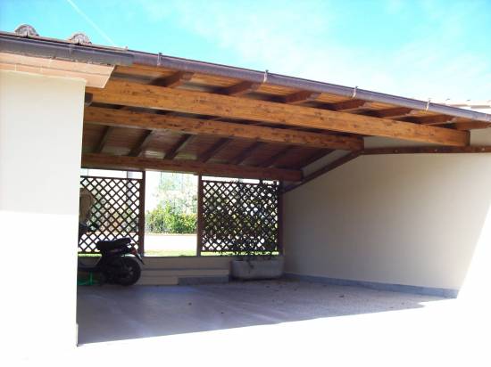 Struttura in abete lamellare . Travi dimensionati secondo calcoli strutturali . Copertura con perlinato di cm.2,0 , guaina ardesiata e coppo toscano in laterizio