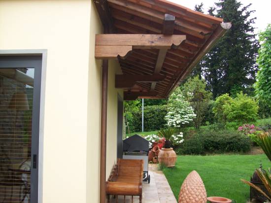 Struttura in abete lamellare con mensole di cm.12x12 con piastre interne . Copertura con perlinato di cm.2,0 , guaina ardesiata e coppo toscano in laterizio