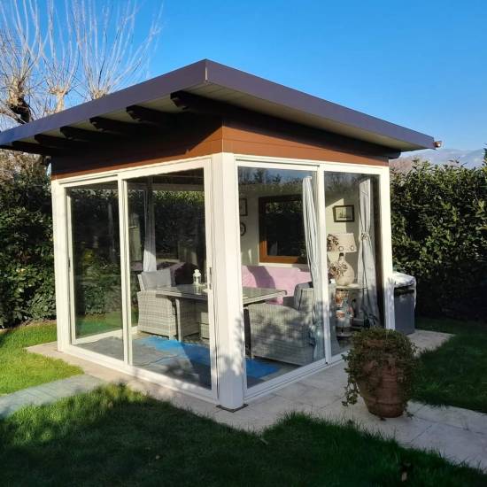 Struttura in abete lamellare con pilastri e travi dimensionati secondo calcoli strutturali . Copertura con perlinato , guaina ardesiata.