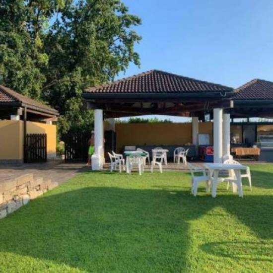 Struttura in abete lamellare con pilastri e travi dimensionati secondo calcoli strutturali . Copertura con perlinato , guaina ardesiata