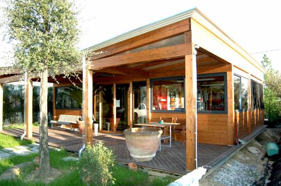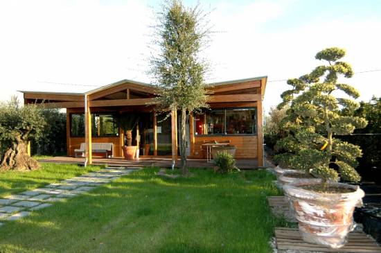 Struttura in abete lamellare con pilastri e travi dimensionati secondo calcoli strutturali . Tetto coibentato e ventilato . Pareti coibentate . Infissi esterni in alluminio con ante scorrevoli e vetro visarm . Veranda frontale con pavimento in Iroko