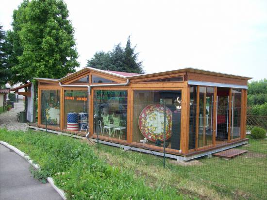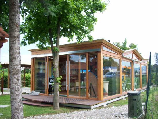 Struttura in abete lamellare con pilastri e travi dimensionati secondo calcoli strutturali . Tetto con perlinato laccato e guaina ardesiata . Pareti con telai in pino e vetri antisfondamento . N.02 porte a due ante scorrevoli con telaio in pino e vetri antisfondamento .