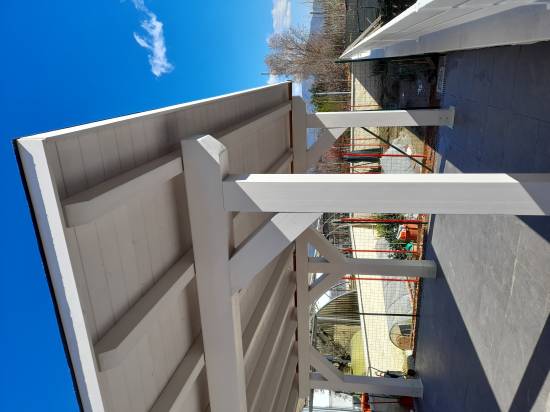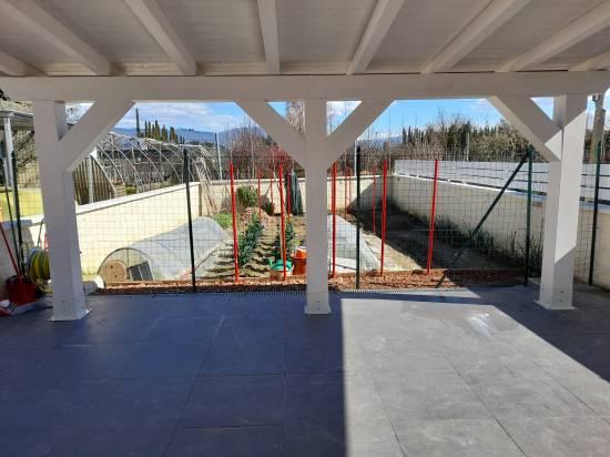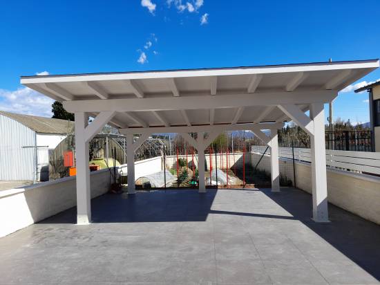 Struttura in abete lamellare con pilastri e travi dimensionati secondo calcoli strutturali . Laccata . Copertura con perlinato e guaina ardesiata .
