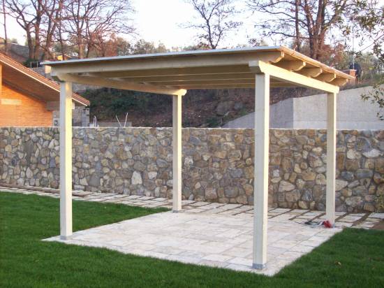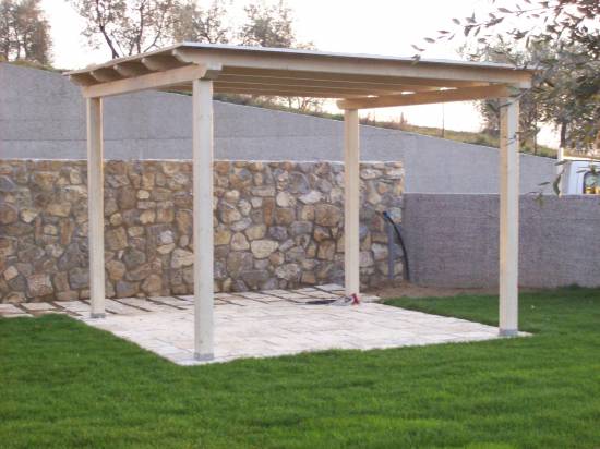 Struttura in abete lamellare con pilastri e travi dimensionati secondo calcoli strutturali . Laccata . Copertura con perlinato e guaina ardesiata .