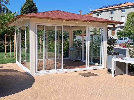 Struttura in abete lamellare con pilastri e travi dimensionati secondo calcoli strutturali . Pareti esterne in alluminio con ante scorrevoli e vetro visarm .