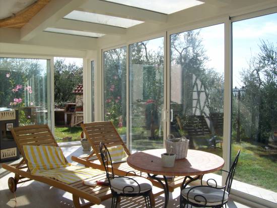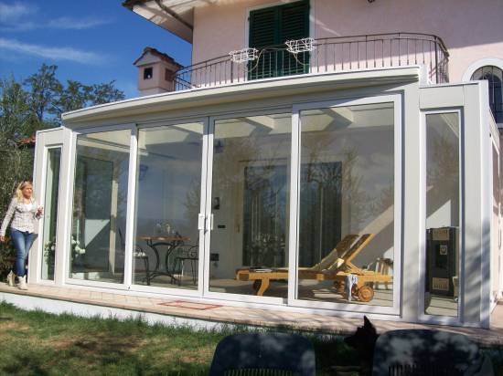 Struttura in abete lamellare con pilastri e travi dimensionati secondo calcoli strutturali . Tetto con vetro a controllo solare . Infissi esterni in alluminio con ante scorrevoli e vetro visarm .
