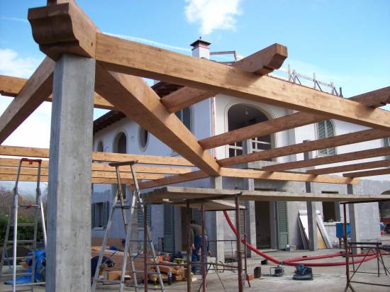 Struttura in abete lamellare . Pilastri e travi dimensionati secondo calcoli strutturali .
