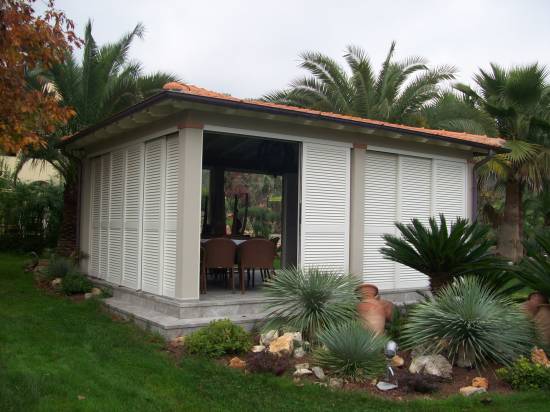 Gazebo a padiglione di mq. 40,0 laccato. struttura in abete lamellare con pilastri e travi dimensionati secondo calcoli strutturali Copertura con tegola in laterizio
